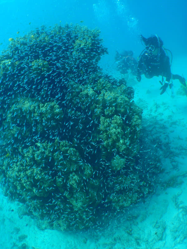 透明度が良かったのでサンゴに群れるスズメダイが光に当たって