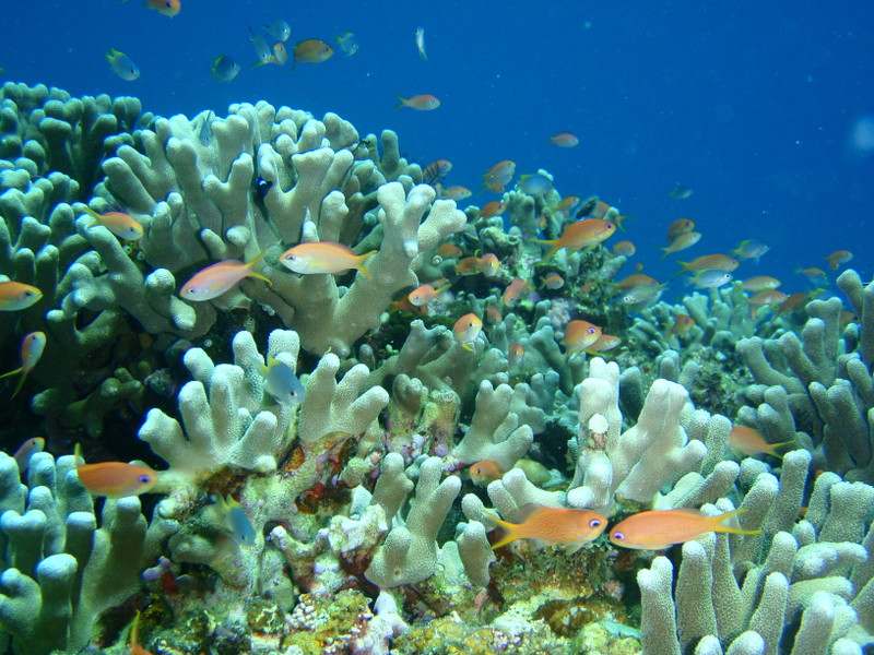 サンゴの周りに群れるキレイなキンギョハナダイを眺め