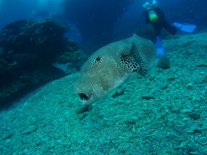 ネハナゴイの群れや、大きなモヨウフグ!!ダイバーの後を付いてきて少し怖かった