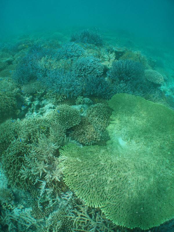 水色が綺麗なデバスズメダイ、超特大テーブルサンゴ