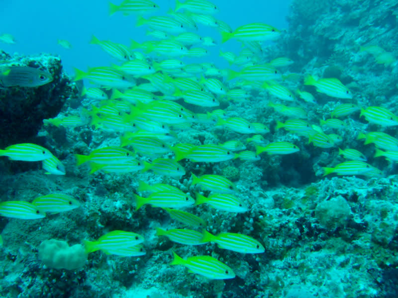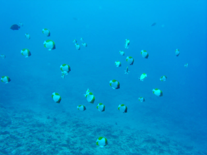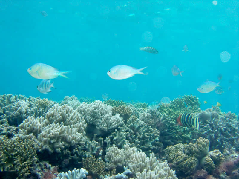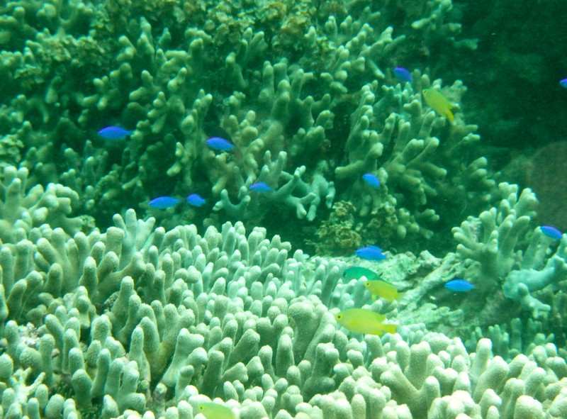 サンゴの上をデバスズメやルリスズメも気持ちよさそうに泳いでいて