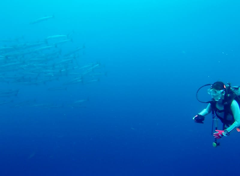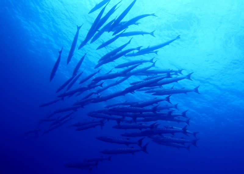 バラクーダーの群れ!!群れを眺めてその下で二枚のビックマンタが