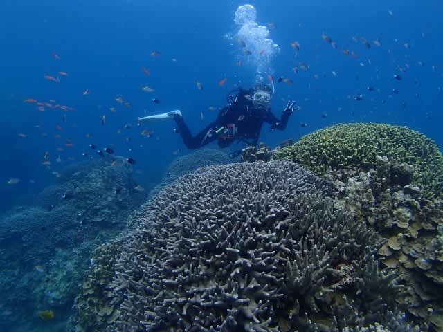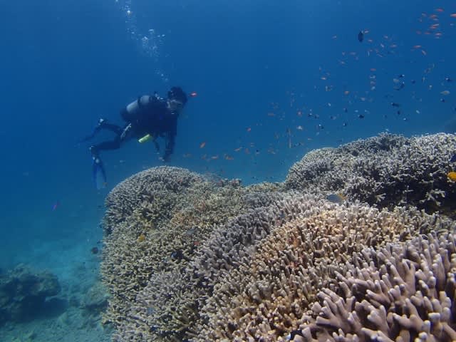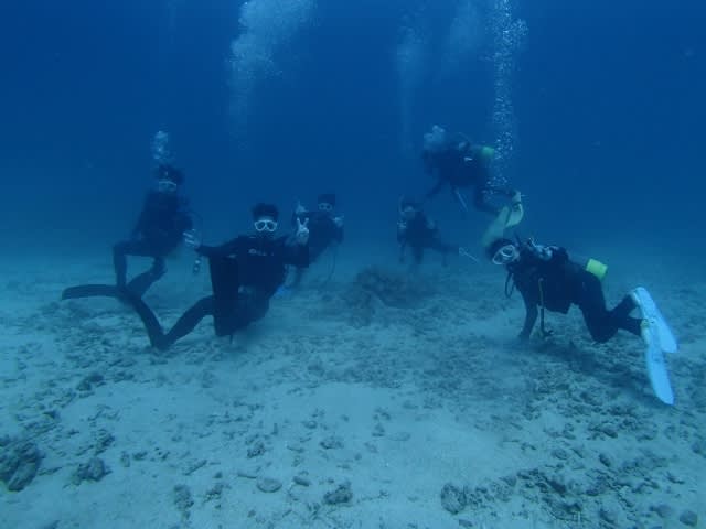 最初は緊張で耳抜きと葛藤しましたが、ゆっくりゆっくり潜降して着底すれば、もう安心。リラックスしたところで水中散歩。