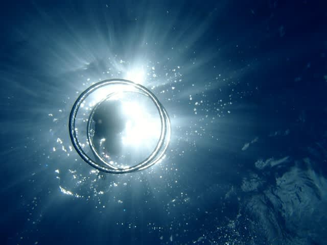 スノーケルは光のカーテンが眼下に降り注ぐ中