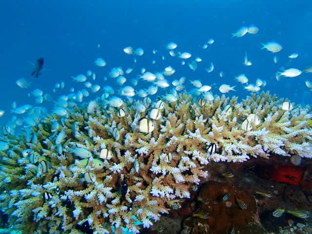 砂地のサンゴにデバスズメダイがわさわさ群れてて、