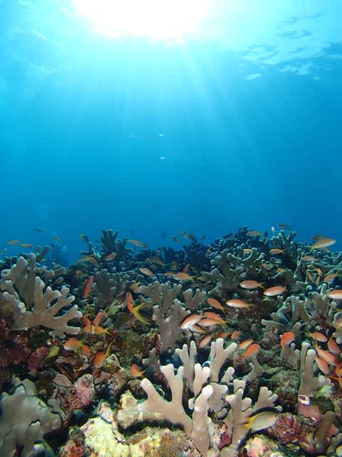 水面からは、サンゴを取り囲むようにカラフルな魚たちを眺めて、