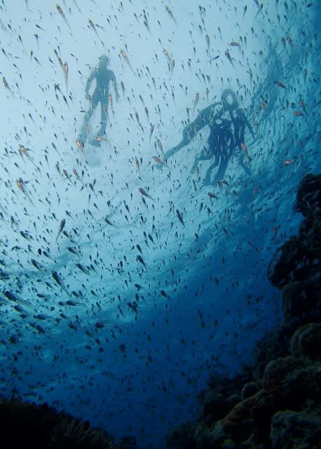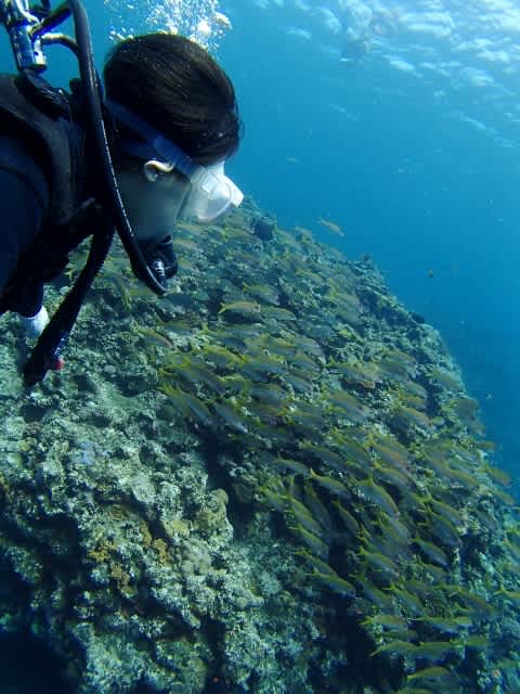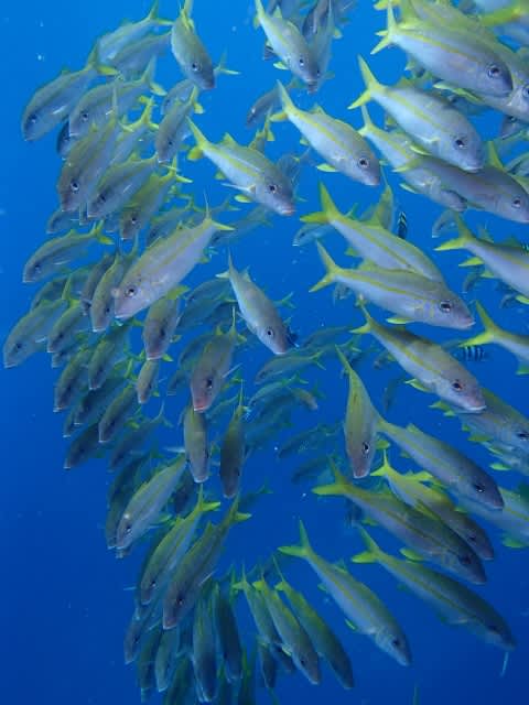 水中はたっくさんのノコギリダイとアカヒメジの群れ