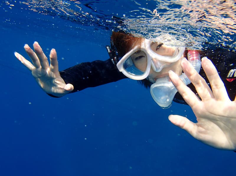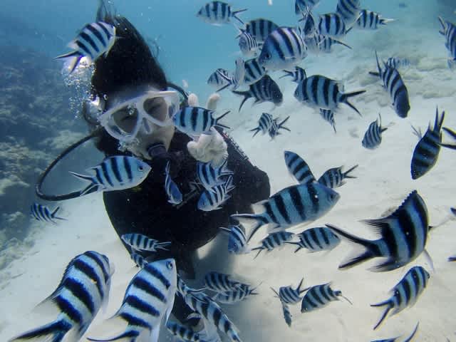 スノーケル中は波と格闘しながらも、グルクンやスズメダイの群れに感動です!