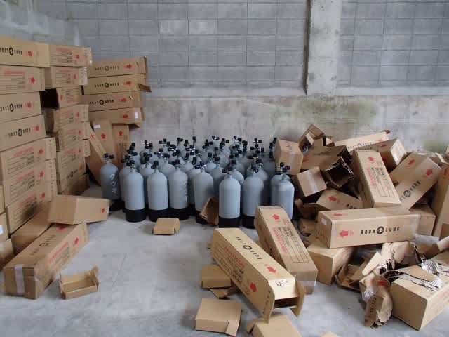 今日、明日はノーゲストのシーフレンズです(-_-)/~~~ピシー!ピシー!そんな本日は、来年から始めるエアーステションの準備???新しいタンクに番号書きなど色々としてきましたよ♪ なかなか大きな倉庫で、雨降ってもこの中で何でも作業が出来ちゃう倉庫なので、雨の日でも問題ナシです!!今日は雨は降ってませんでしたけどね(^_^;)明日も引き続き作業の日ですけど、頑張ります♪