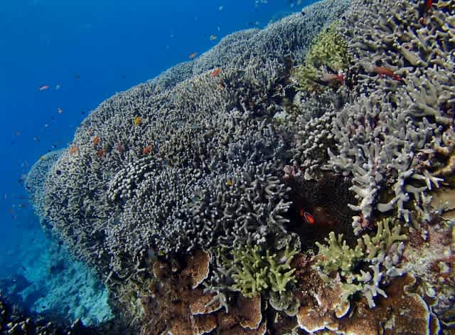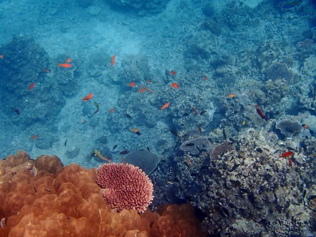 ボートの下からとこを見ても珊瑚、珊瑚でその回りに居るスズメ
