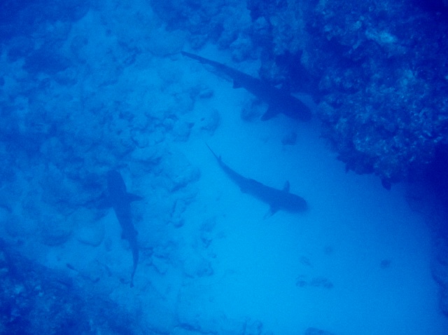 水底の砂地にホワイトチップが3匹かたまってぐるぐる