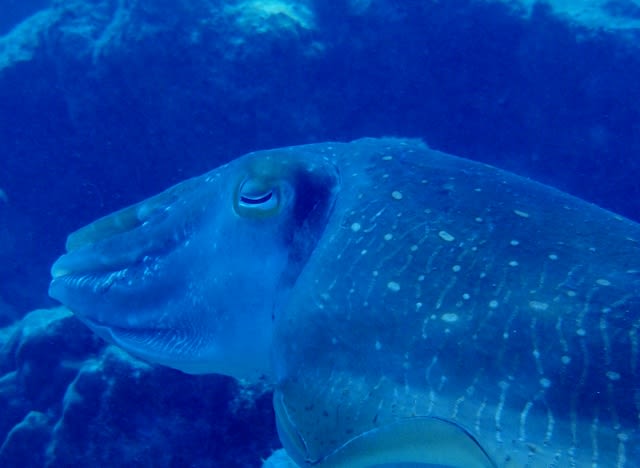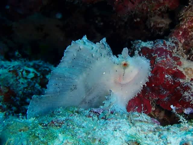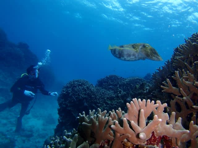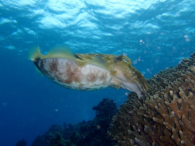 浅場のサンゴにはでっかいコブシメが産卵しに来てました