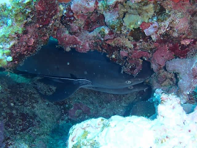 大きなサメに50cmくらいの小さなサメが岩の下で朝寝坊して