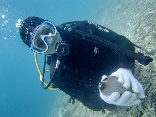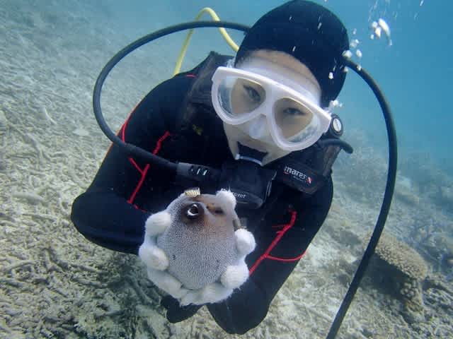 キュートなフグとにらめっこ♪泳いで珊瑚を大満喫>^_^<