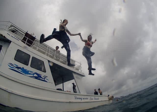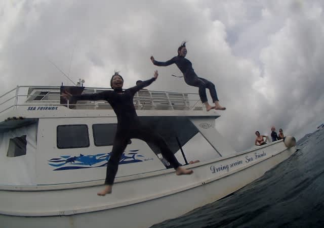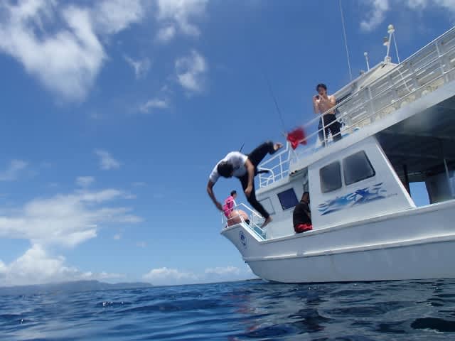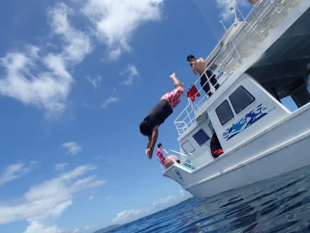 お昼休みは、青い海にみんなで飛び込み大会開催でしたよ。