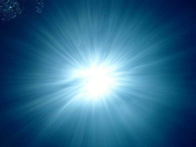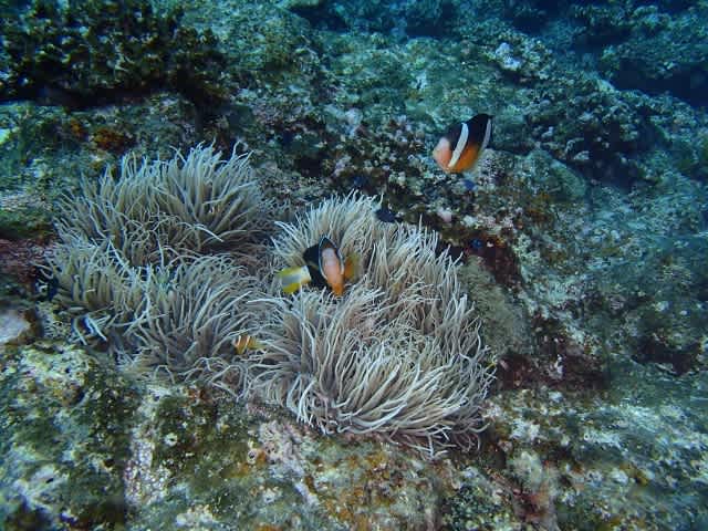ハナゴイやスズメダイが太陽でキラキラ輝いて