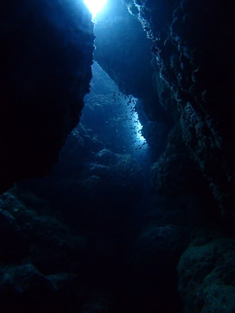 水面近くまでそびえ立つ山脈みたいな珊瑚礁の上を
