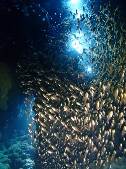 穴の中にはキンメモドキ、テンジクダイ、ハタンポの子供達もどっさりいて迫力満点!