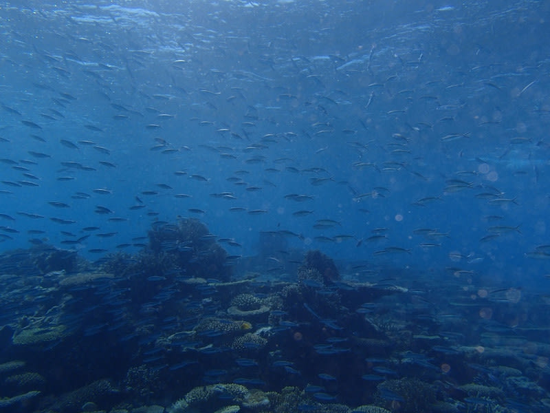 サンゴの周りにはグルグンの幼魚がわんさか群れてて