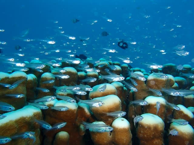 しろ~い砂地 根に群れるスカシテンジクダイやグルクンのちび