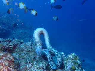 その下ではニセゴイシウツボがでっかいタコ食べようと格闘中でした!