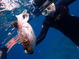 素潜りもぶくぶくやって~ コクテンフグもむんずッっと捕まえました♨