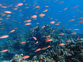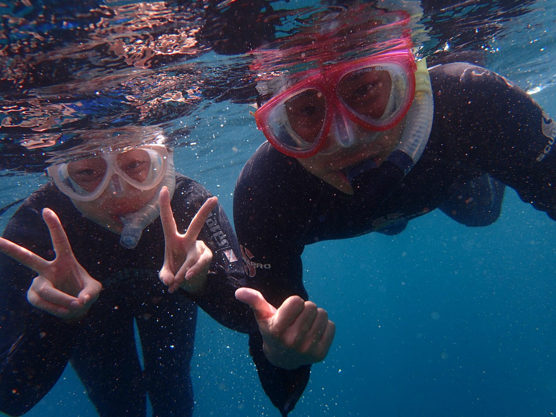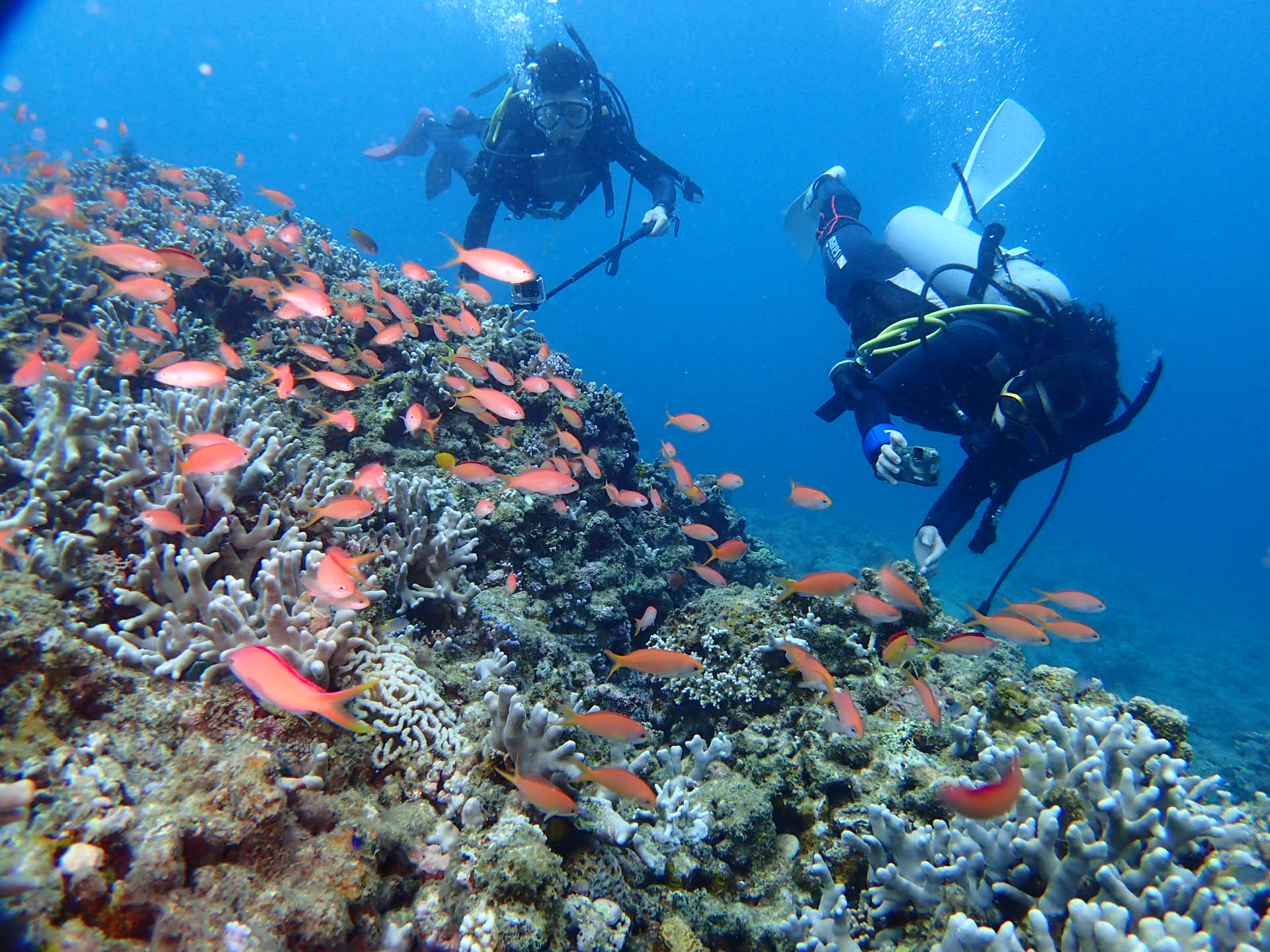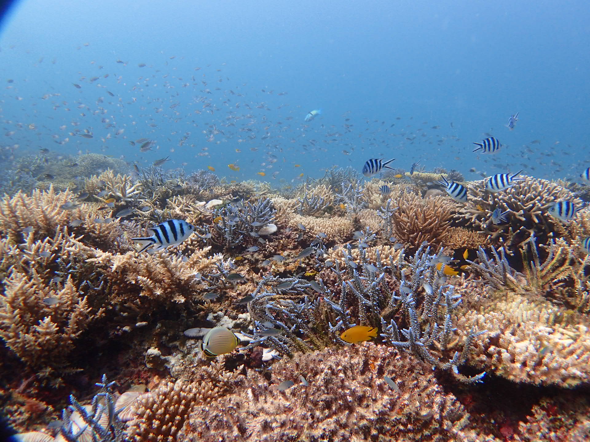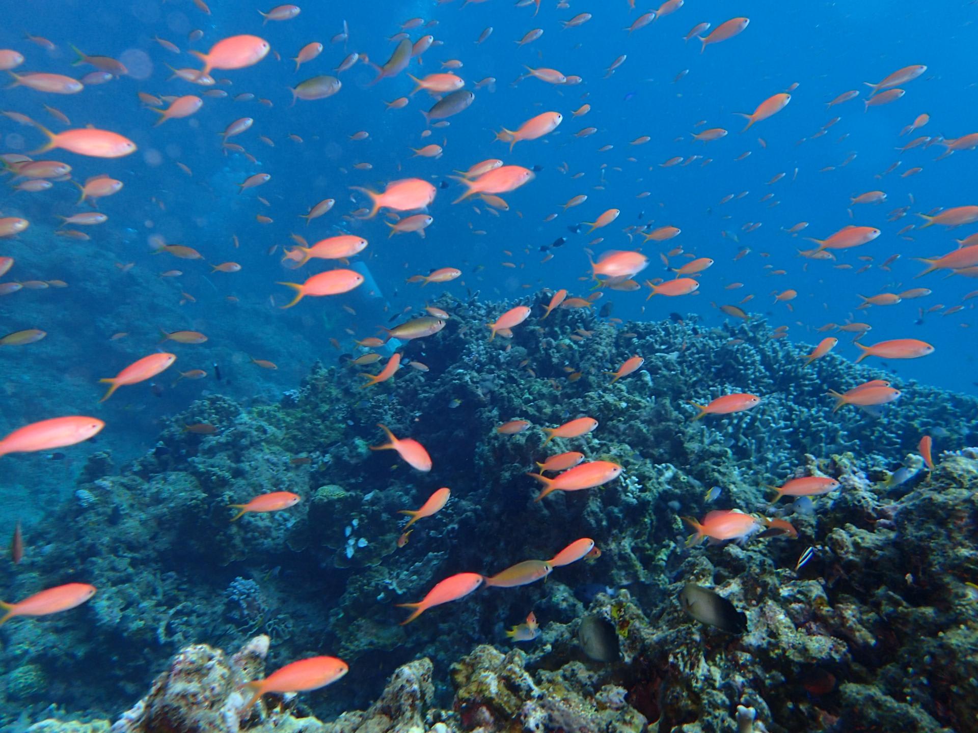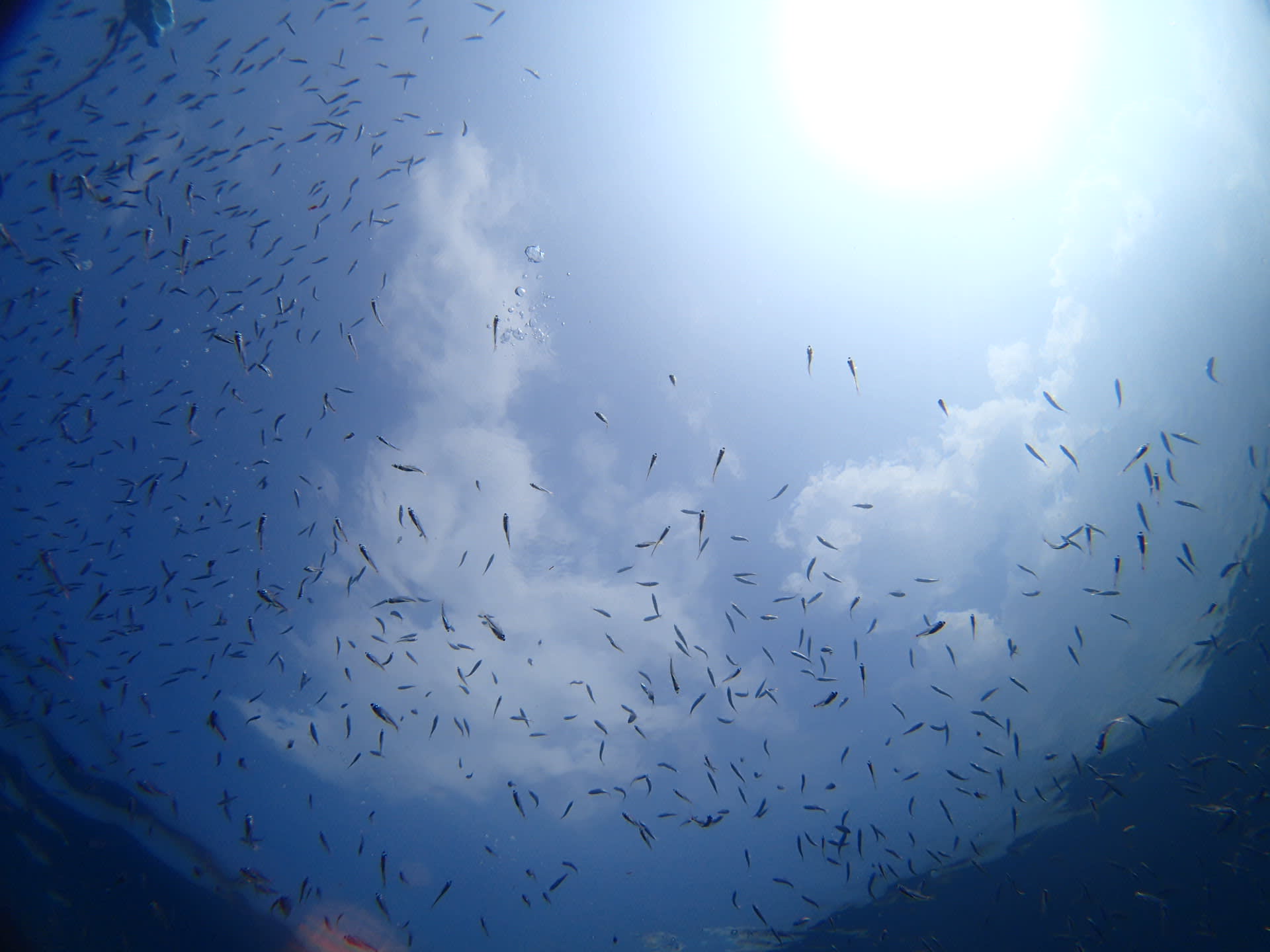 ハマサンゴに居つく幼魚たちも太陽で光って美しいですね