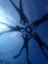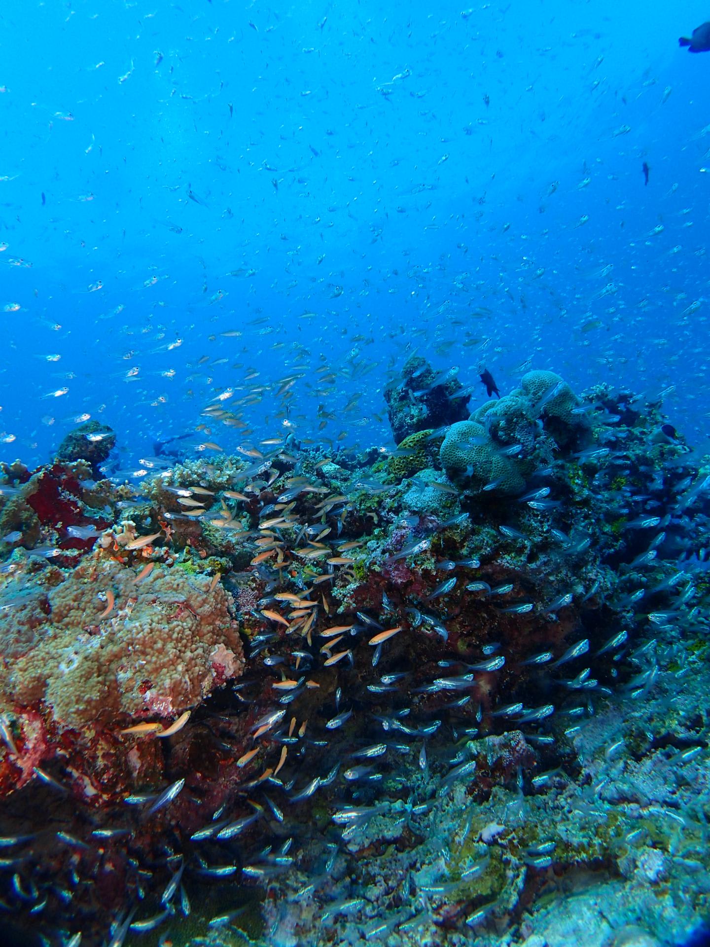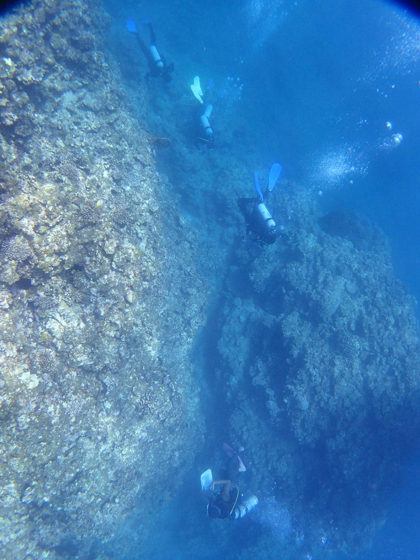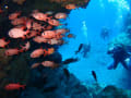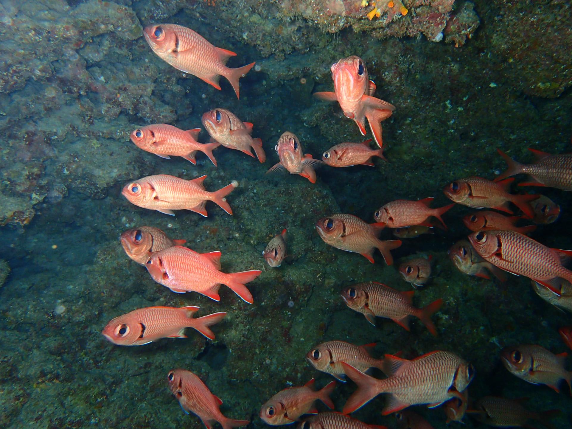 豪快なV字の地形に、アカマツカサの魚影はなんとも神秘的でした。