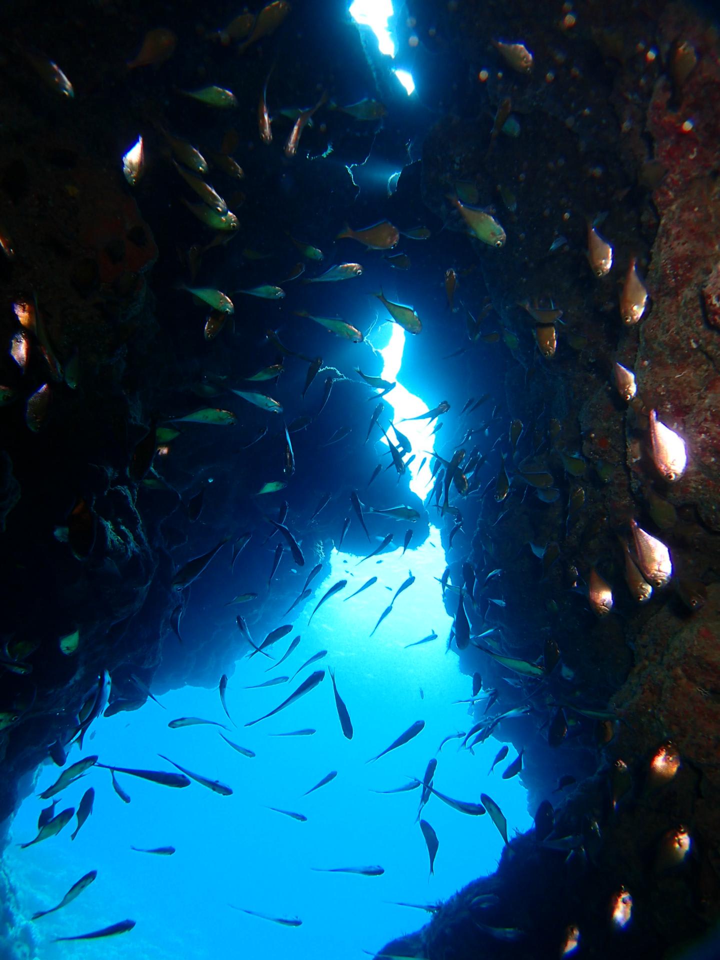 奥のアーチに行くと上方光のカーテンの中にホワイトチップがうろうろ