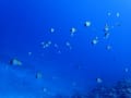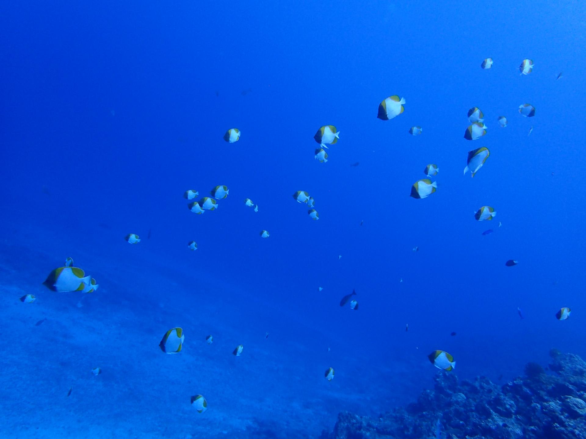 青い世界に白と黄のカスミチョウチョウウオがよく映えますね♪