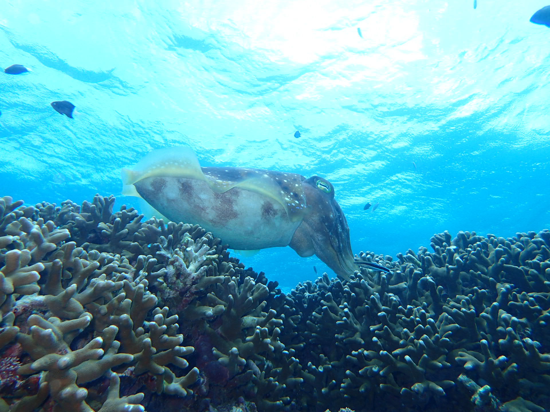 大きなコモンシコロの上をスズメダイたちが気持ち良さそうに踊っていましたよ~