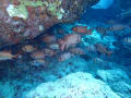 太陽の日差しで、ハナゴイやスズメダイたちが、