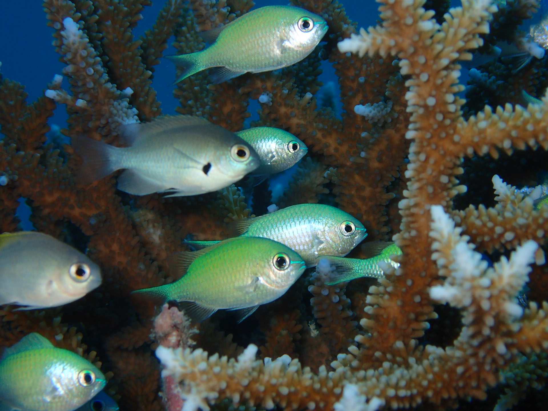 太陽の日差しで、ハナゴイやスズメダイたちが、