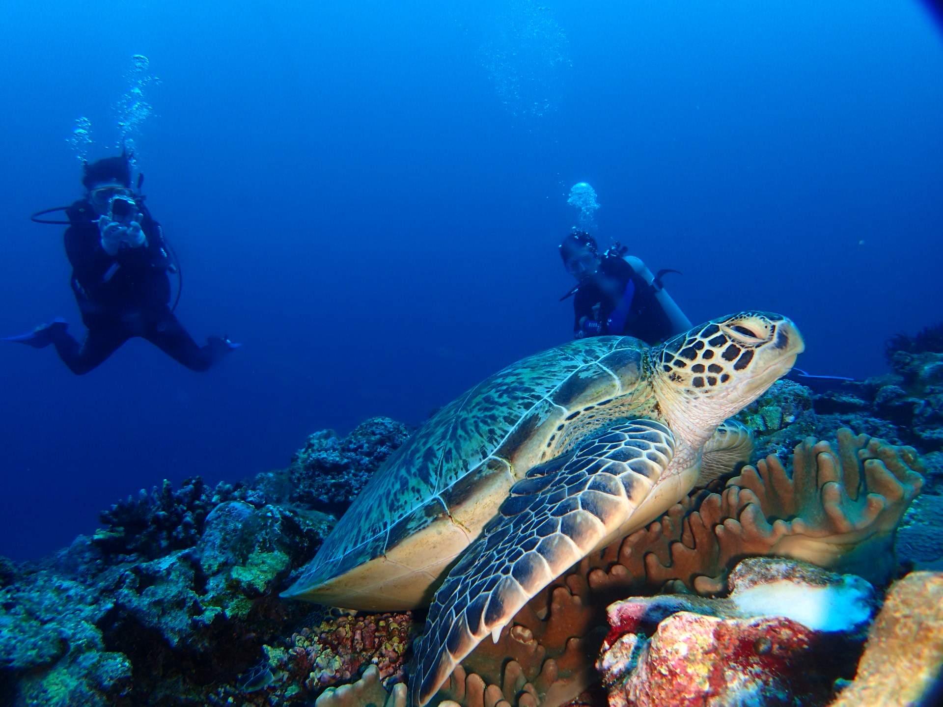 沖のベッドにはふてぶてしい顔したアオウミガメが鎮座★