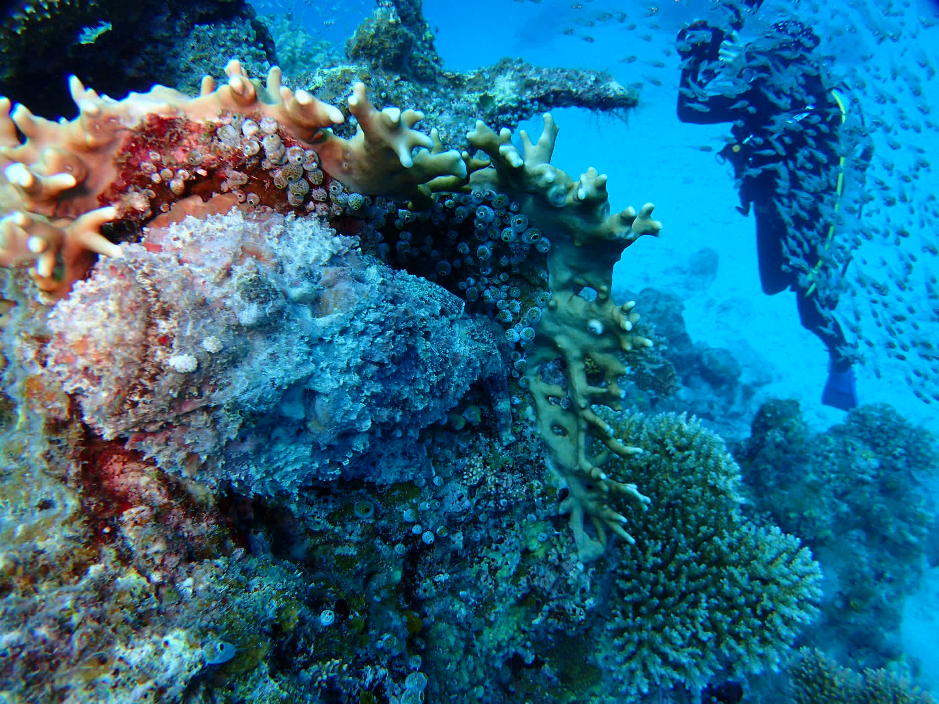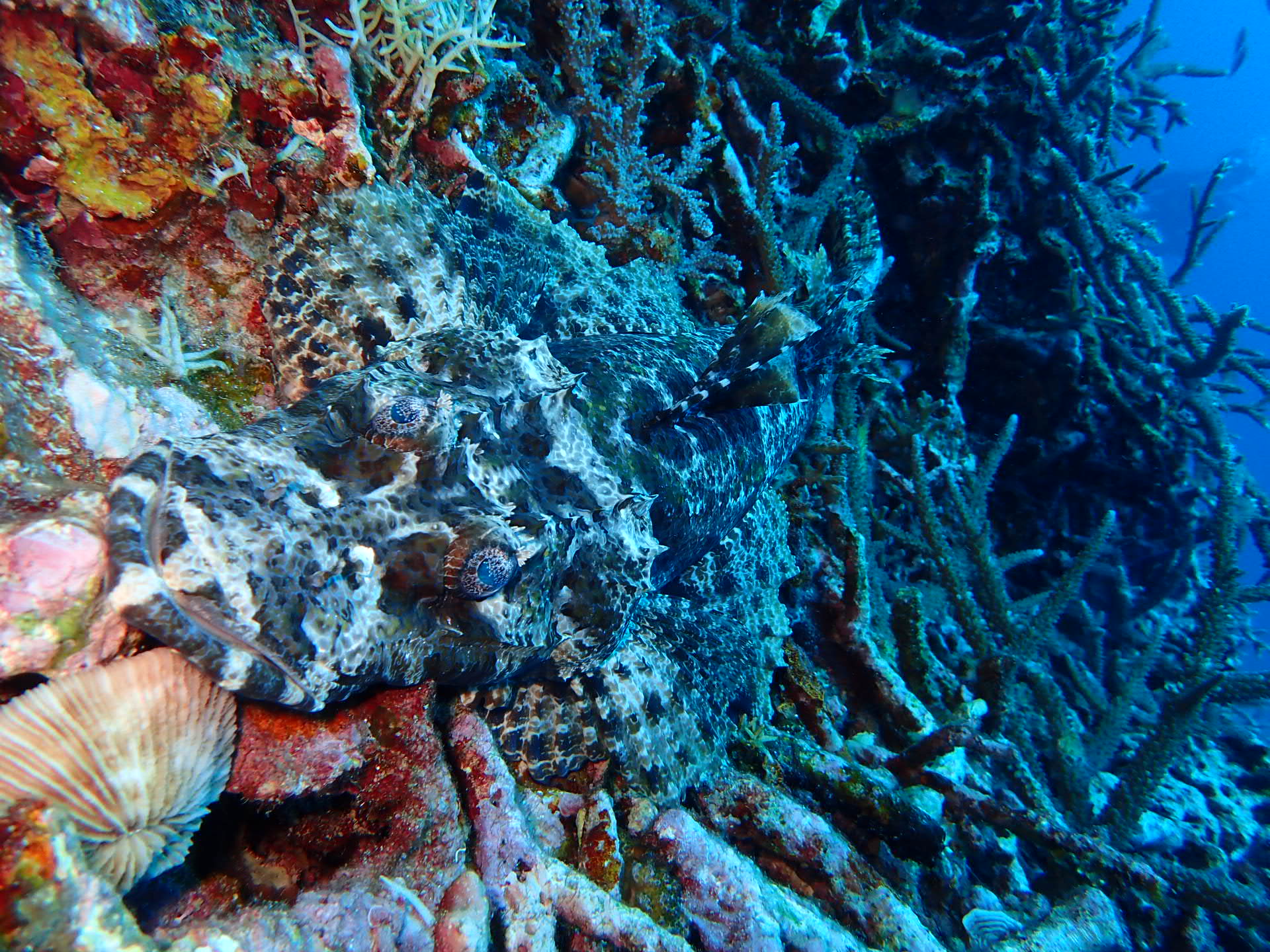 スカシのたくさんついた根に それを狙うオニダルマオコゼが鎮座してます