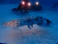 雨が降り少し薄暗くなった水中で ライトに照らされるコブシメたち