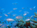 ユビエダハマサンゴの群生に群れるスズメダイ ハナダイ達(#^.^#)