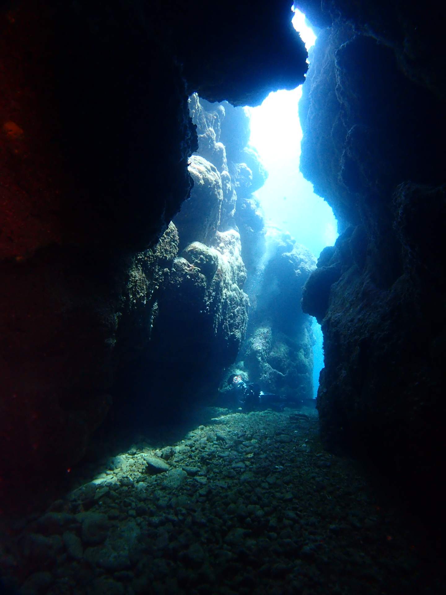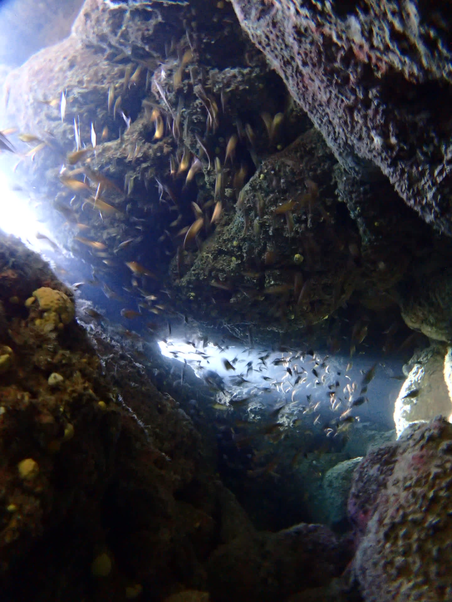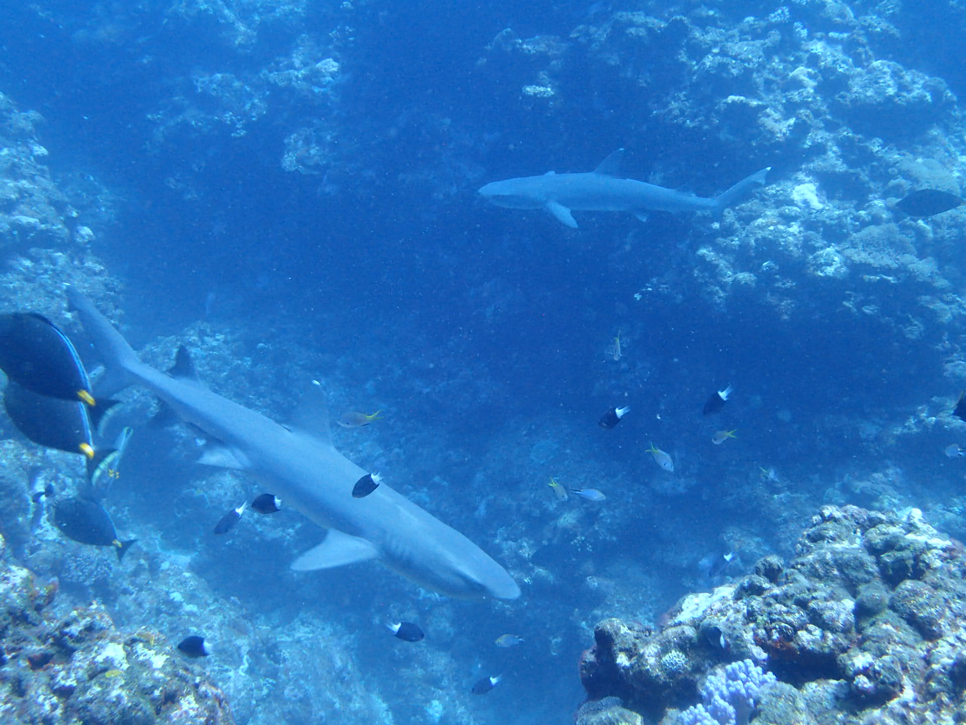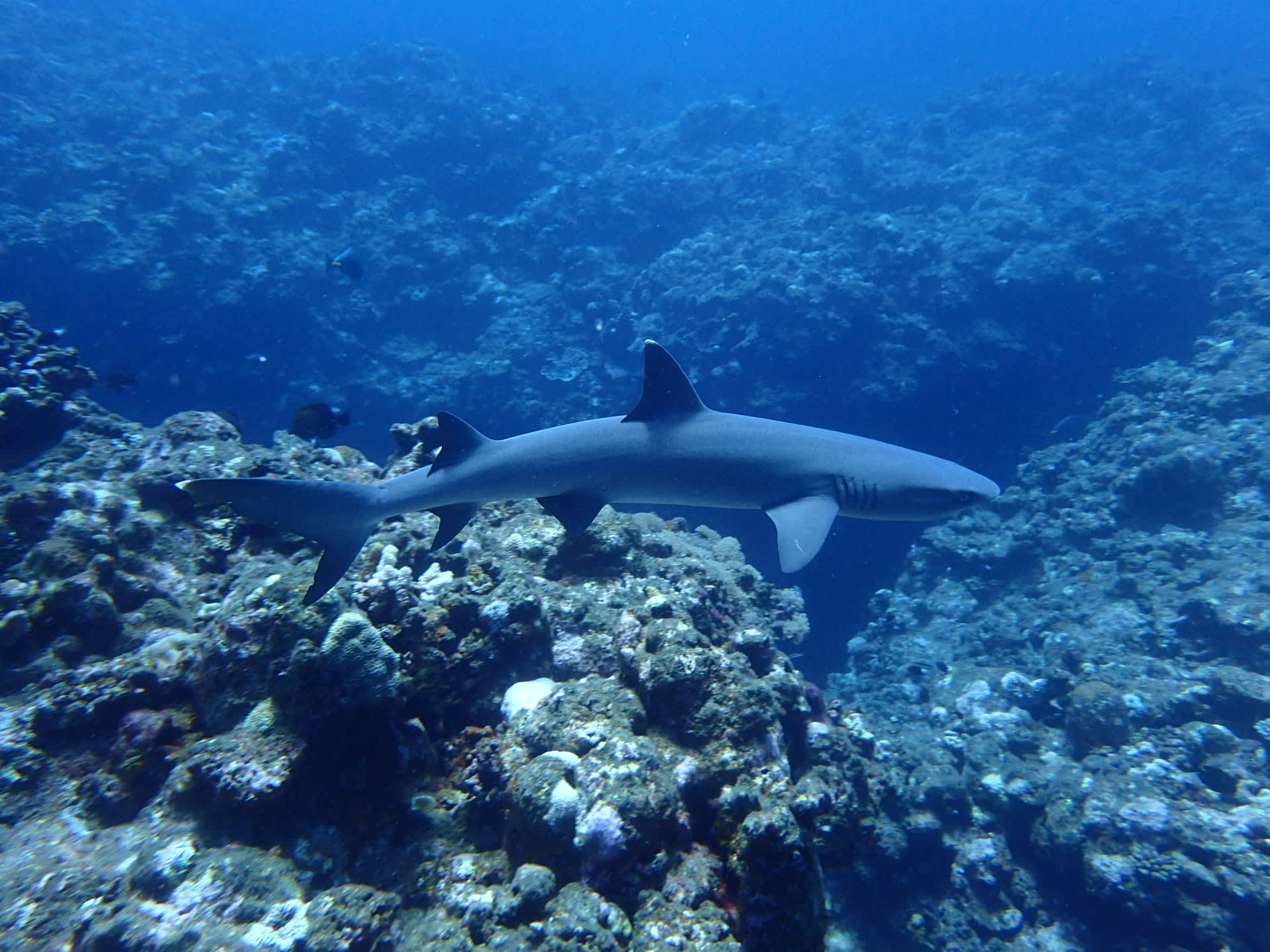 巨岩を縫うようにはしっている水路を 迷路気分でおよぐと、どこからともなくホワイトチップが泳いできましたよp(^^)q