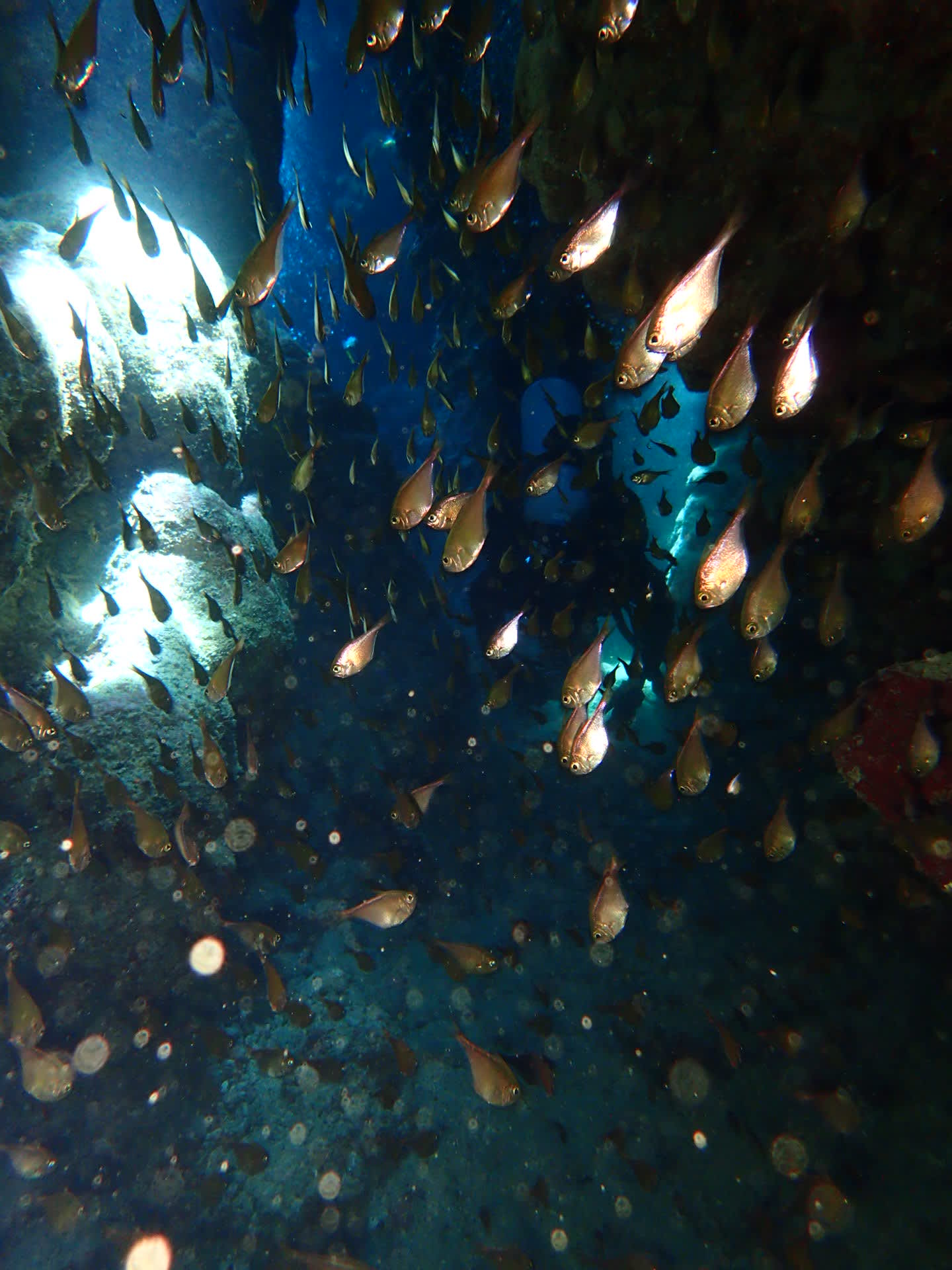 サンゴの根を覆い尽くすような、テンジクダイ各種&グルクン稚魚の群れが華やかですねぇ(*´∀`)(*´∀`)