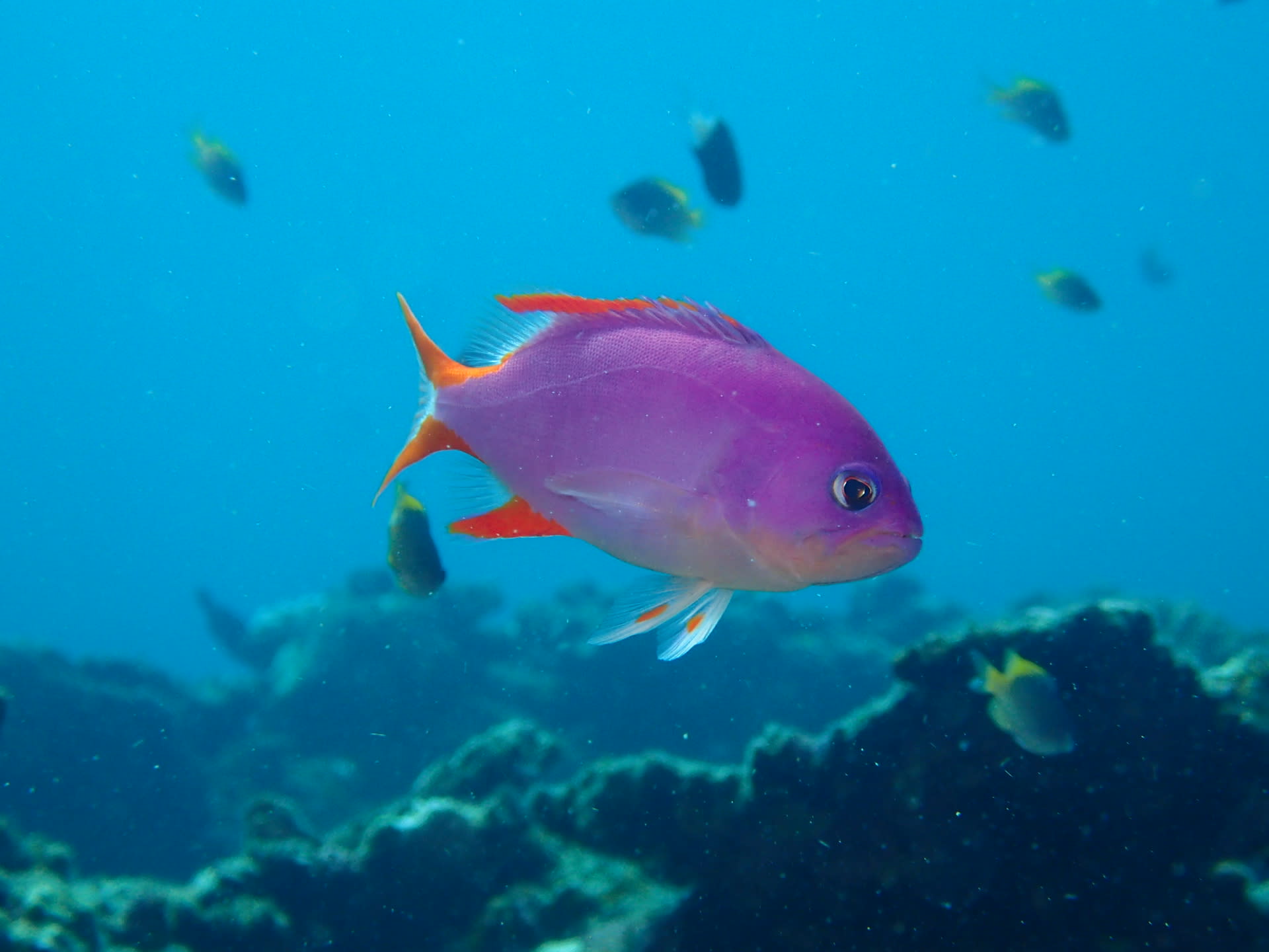 流れが思ったよりありましたが、潮に誘われてデバスズメダイやリュウキュウスズメダイたちが散って、南国的な光景がひろがってましたよ(^○^)