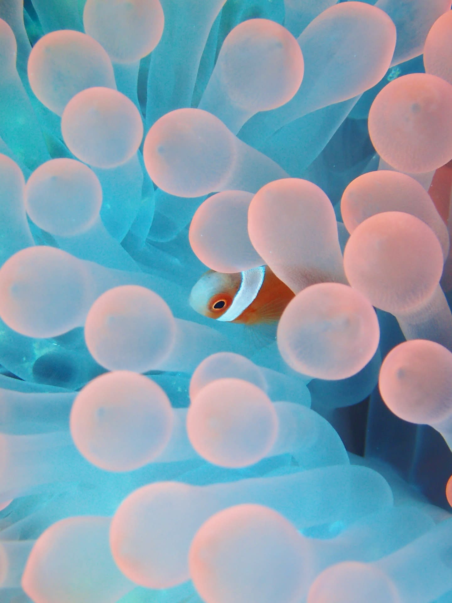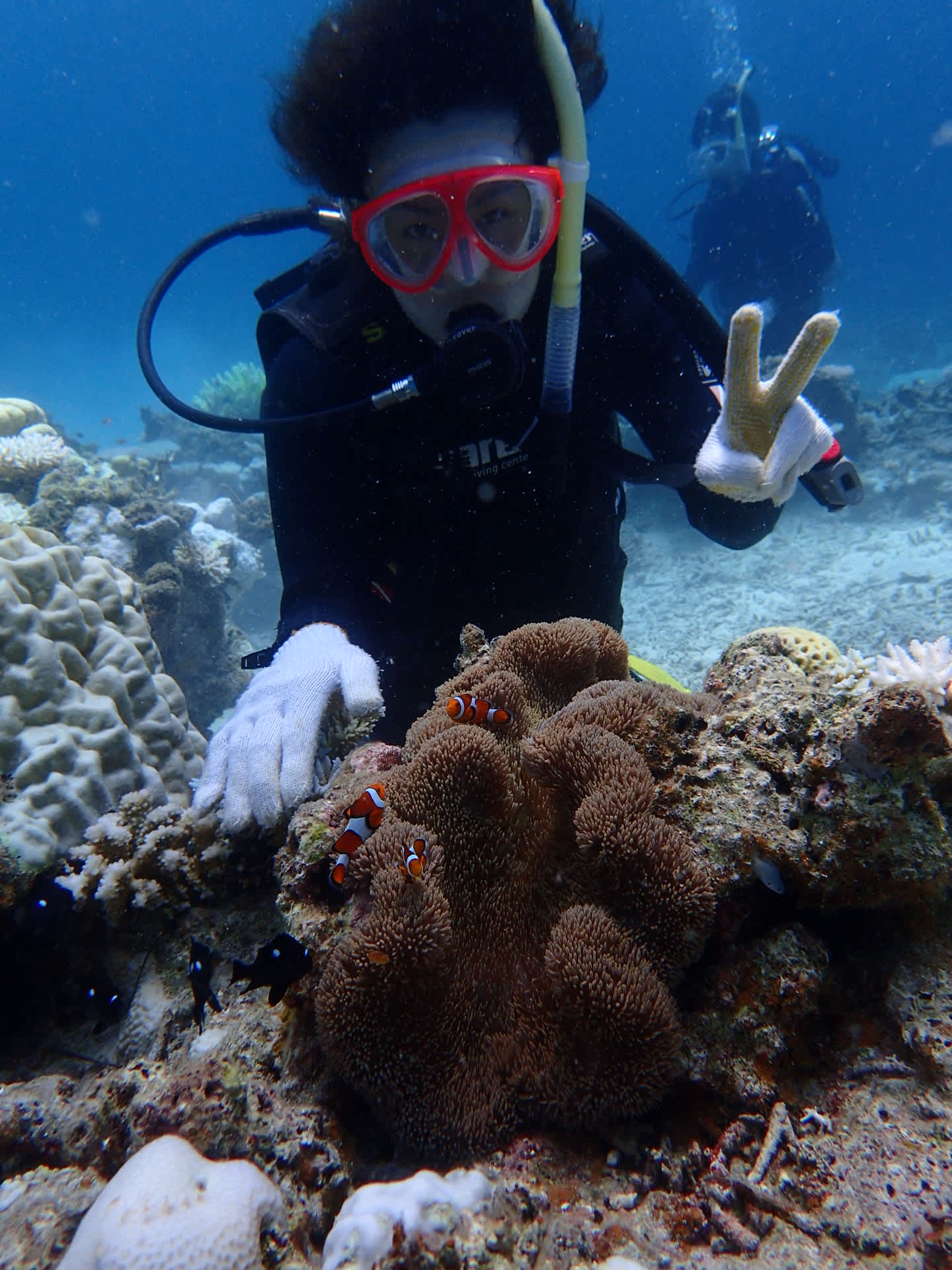 凶暴なハマクマノミさんや、揺らめくやわらかさんごに包まれながら