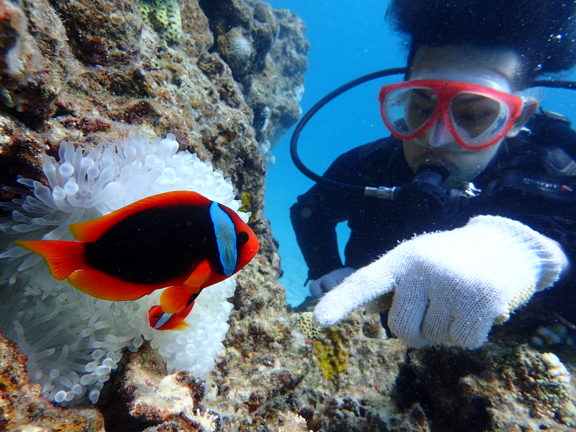 やたら威嚇するクマノミファミリーとコミュニケーション!?をとってたら、ガブリンチョされ、これまたビックリΣ(゜Д゜)
