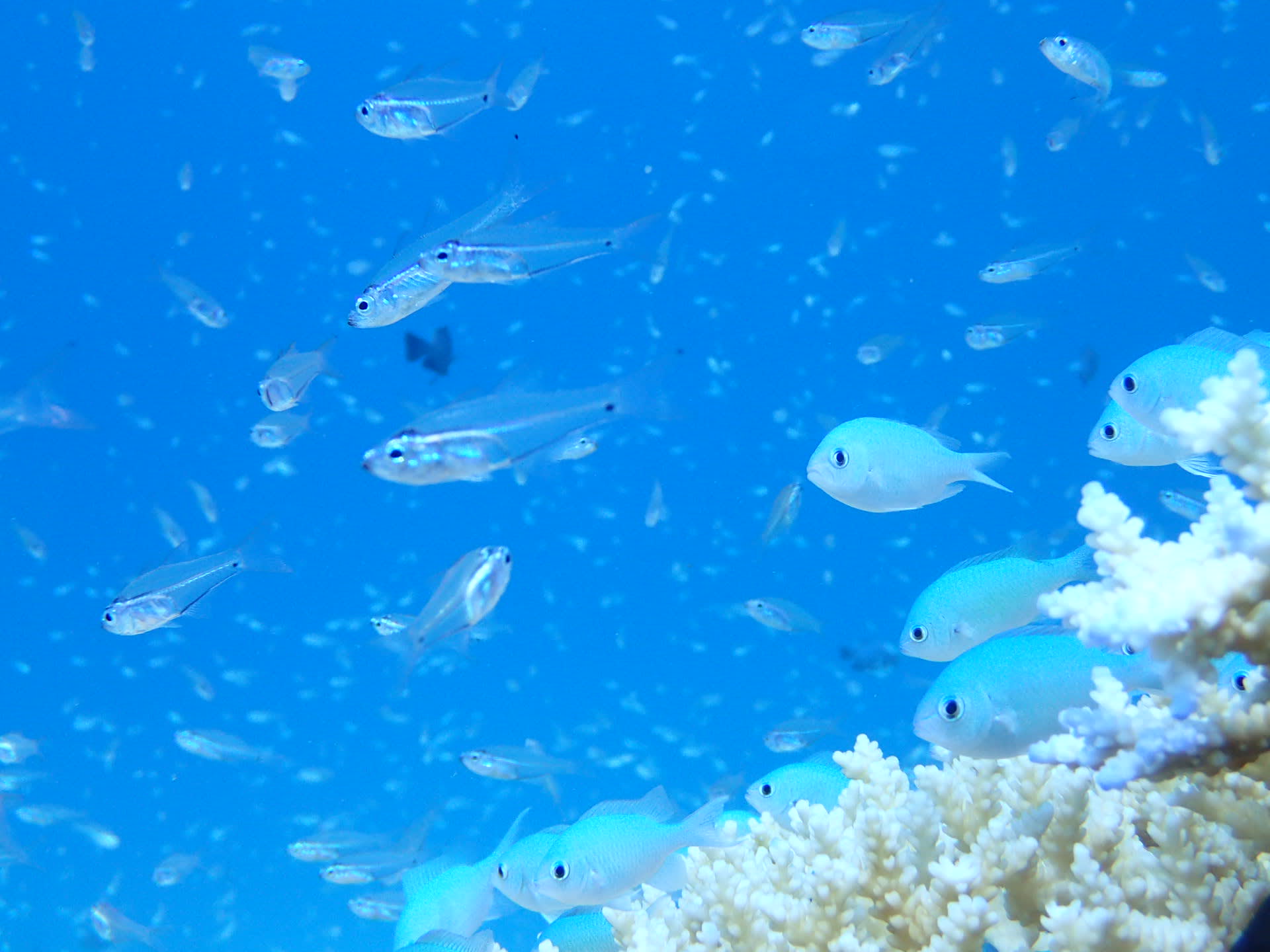 海中には スーパーブルーのスズメダイたちがたっぷり~