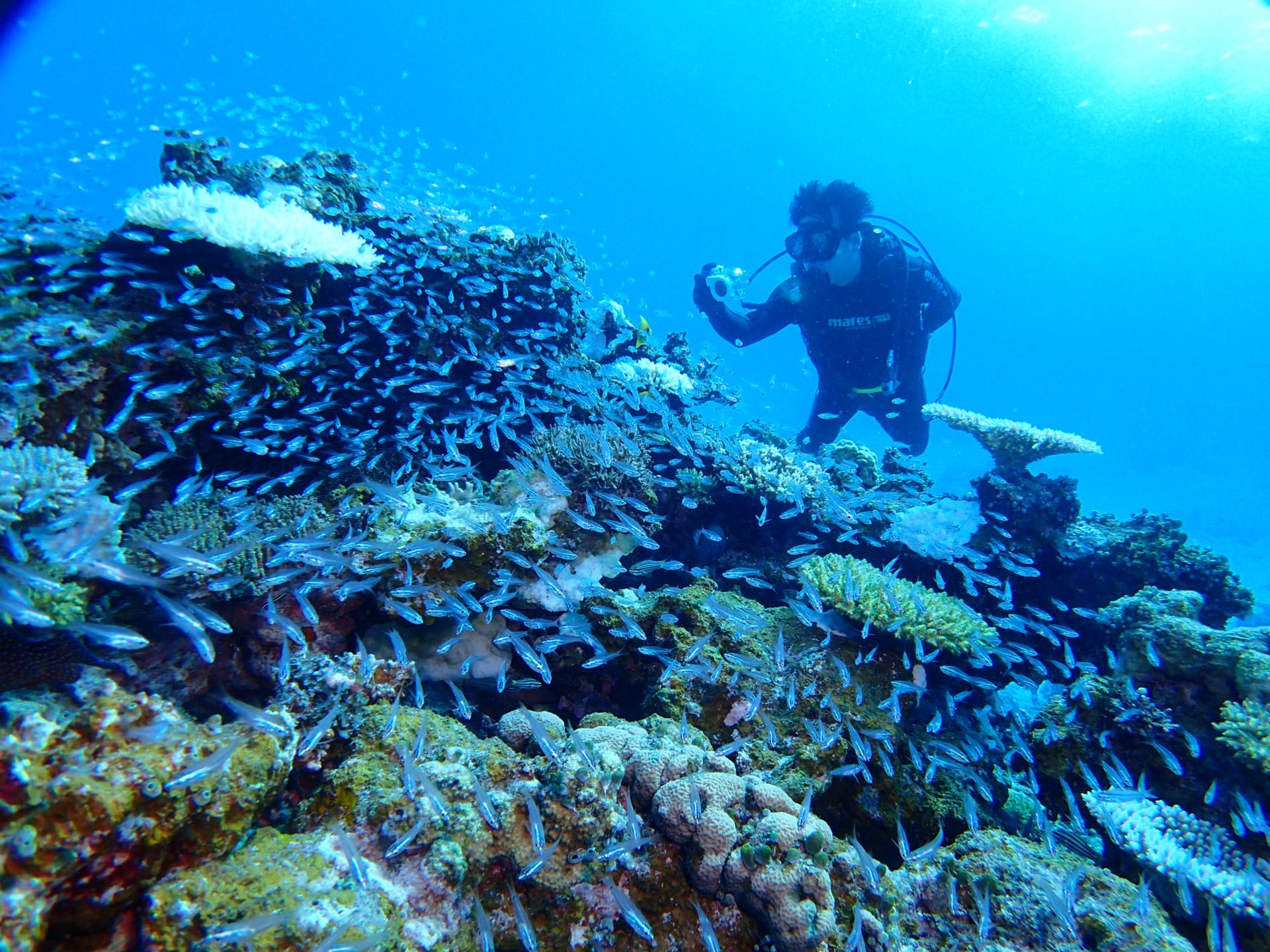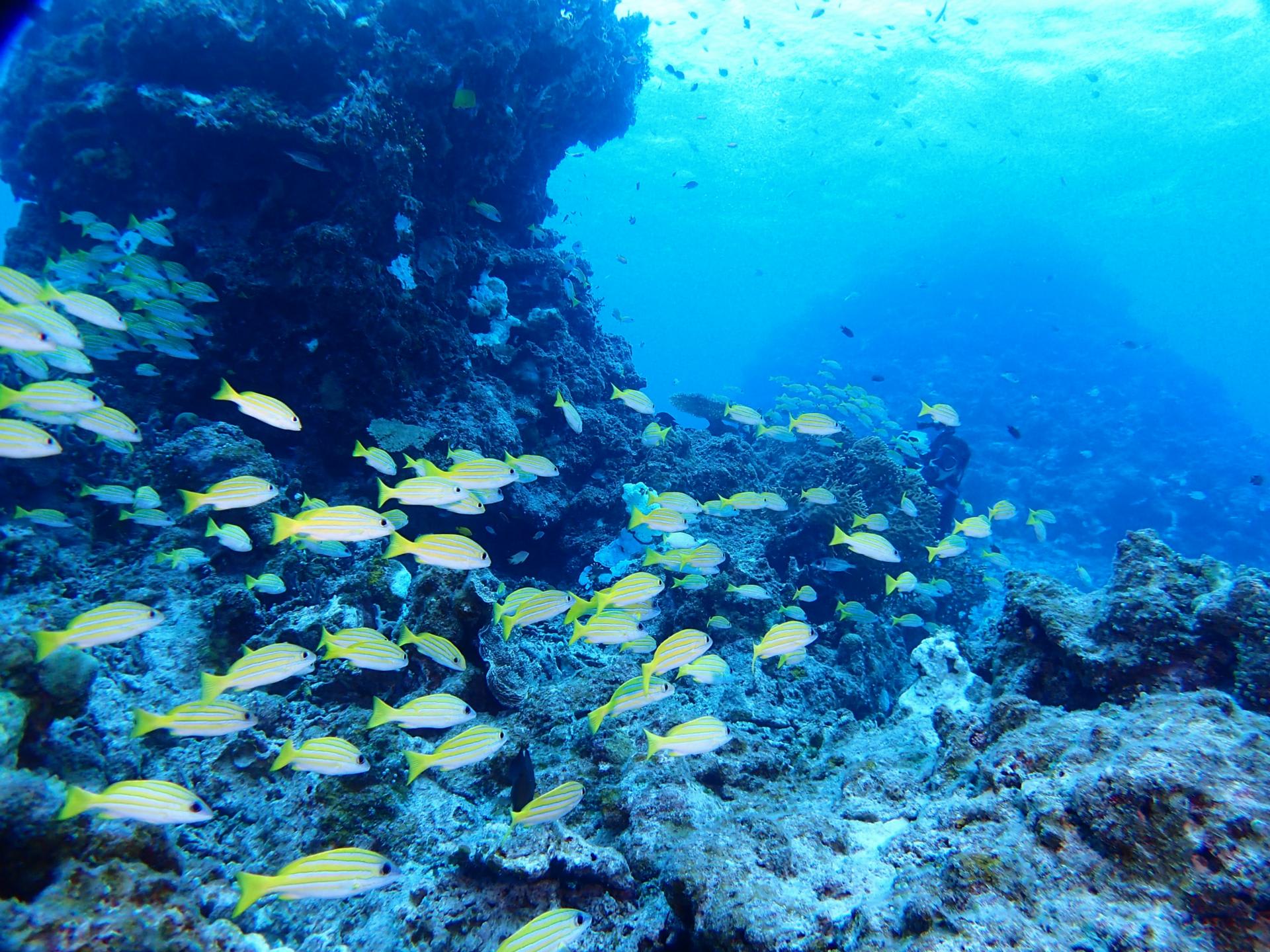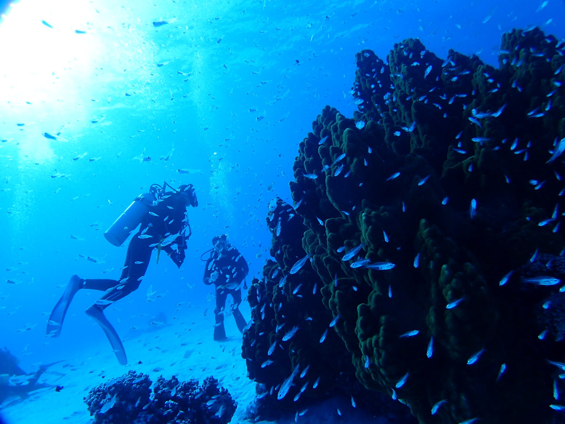 スズメダイもたくさん住み着いているので、一緒になって泳げて気持ちがいいですね。