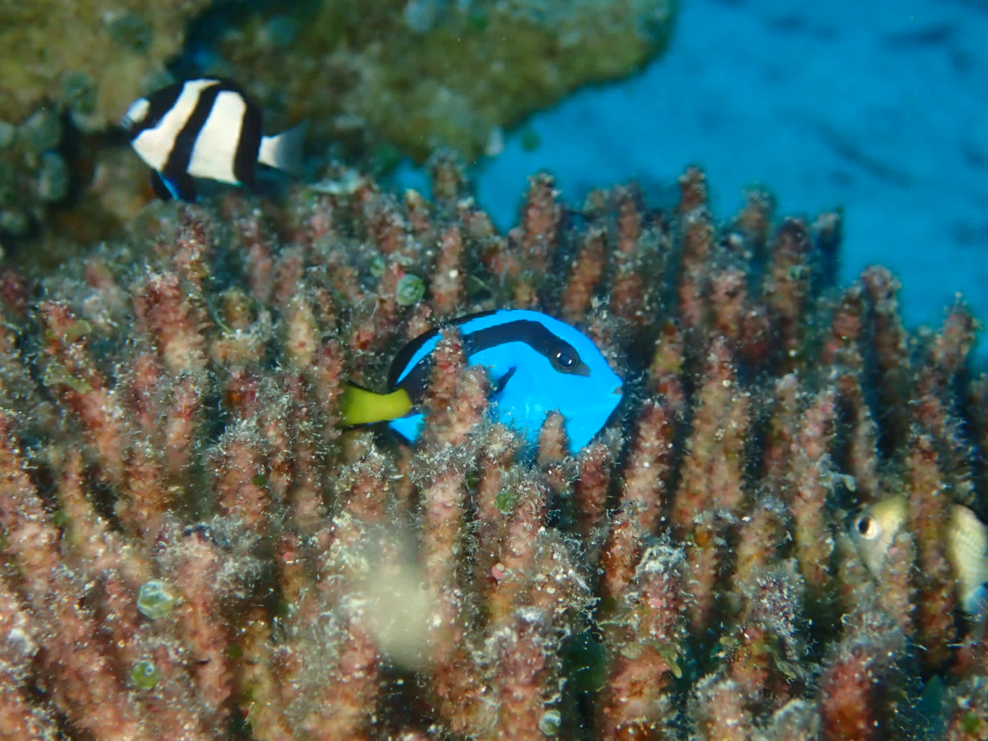 サンゴのおウチが大好きで、なかなか全体を見せてくれない、とてもシャイなドリーは、「ナンヨウハギ」