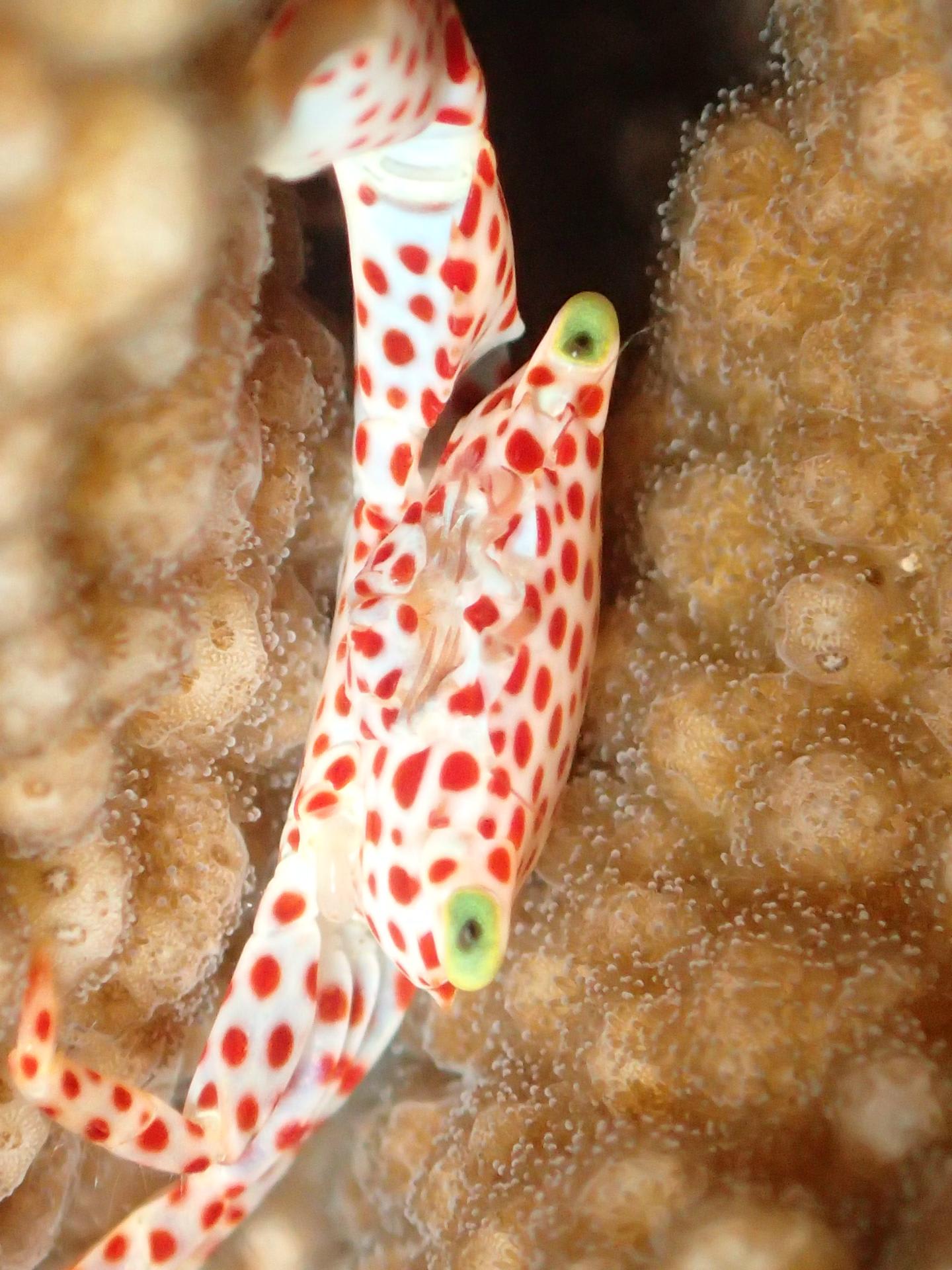 穴の中には親指サイズで体の模様のキレイなイセエビちゃん♪