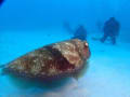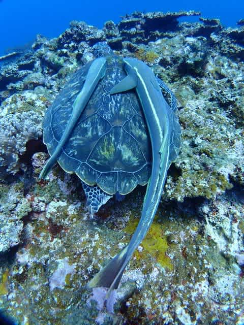 大きな甲羅 よりもさらにでっかいコバンザメ2匹もしょって ぐーぐーねてます~