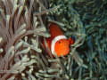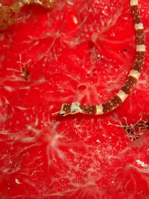 定番のハナヒゲウツボちゃん 真っ赤な絨毯の上にオビイシヨウジがちょうどいて