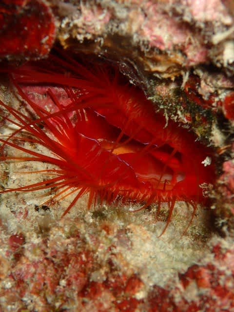 ぴかりんと青白く発光するウコンハネガイ、もりもりのユビエダハマサンゴの森♫