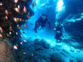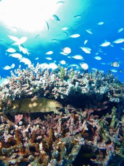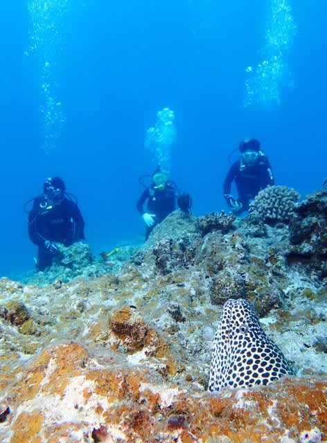 にんまり顔のニセゴイシウツボやカスミチョウチョウウオたち、洞窟の魚たちも群れててステキでした(^^)
